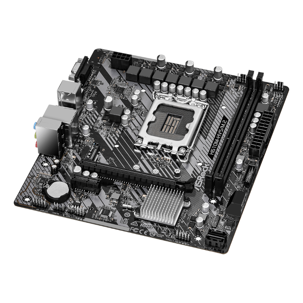 For connectivity and multimedia, this m-ATX motherboard features HDMI and D-Sub outputs, allowing support for multiple displays. Audio performance is enhanced by the Realtek ALC897 7.1 CH HD Audio Codec, delivering rich and immersive sound. Additionally, the board includes 4 USB 3.2 Gen1 ports (2 rear, 2 front) and 6 USB 2.0 ports (4 rear, 2 front) for convenient connectivity, along with Realtek Gigabit LAN for fast and stable networking. Compact yet versatile, the ASRock H610M-HVS/M.2 R2.0 is a great choice for a wide range of PC builds.