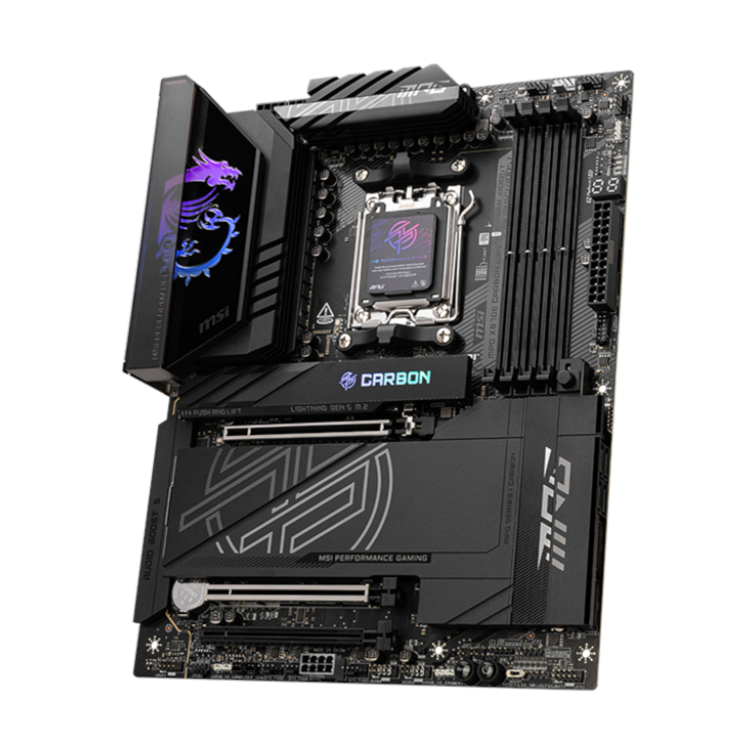 MPG X870E CARBON WIFI employs a carbon black colour scheme and stylish pattern over Mystic light RGB lighting to show a different identity.